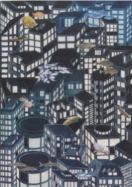 The plates were printed in various shades of blue, cut apart and reassembled in alternating combinations in a puzzle-like manner.